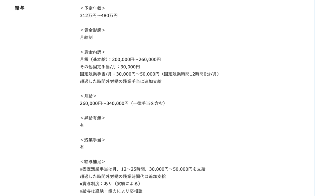 求人票に記載された予定年収の幅は312万円〜480万円となっており、経験・能力によって幅があります。新卒・ブランク明けであれば下限に近い水準からのスタートになりますが、経験を積むにつれて上限に近づいていきます。