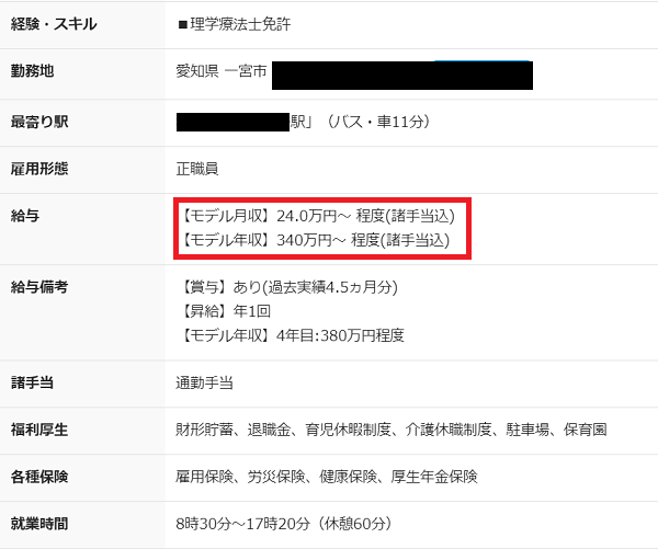 求人にあるように「年収は340万円~」となっています。理学療法士求人の平均的な年収が350万円前後であるので、同程度の年収だといえます。